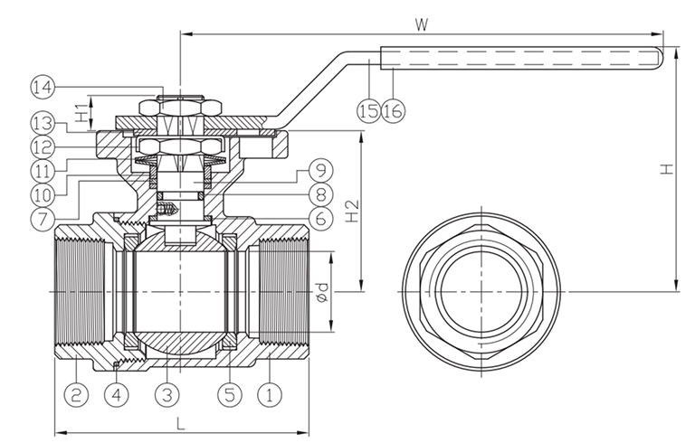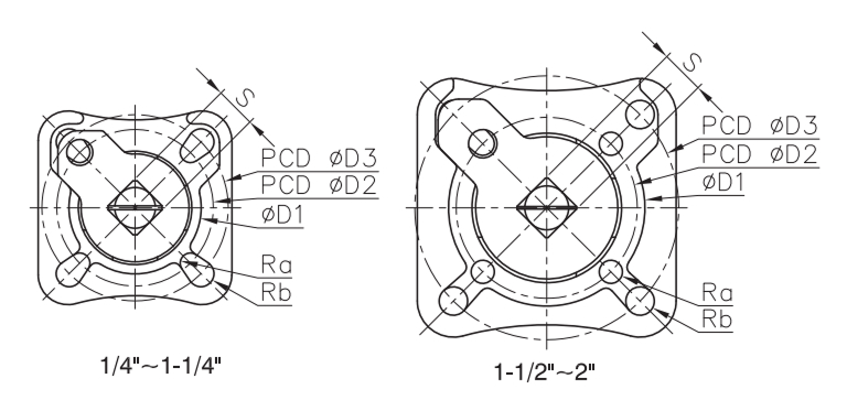 | NPS | d | L | H | H1 | H2 | W | S | D1 | D2 | D3 | Ra | Rb | ISO 5211 | Torque (in·lb) | Weight (lb) |